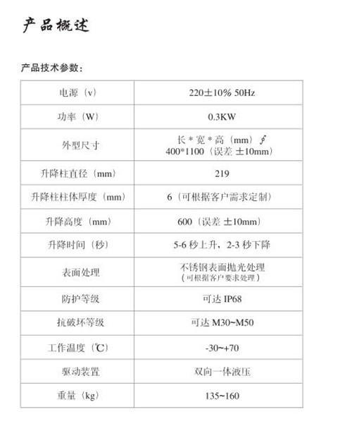 路障升降柱主要由路障升降柱體、氣缸、導(dǎo)向軸、封蓋、外箱、鎖等部分組成。升降體:采用304國(guó)標(biāo)不銹鋼8mm/6mm厚鋼管加工形成,具有高強(qiáng)度的承重和抗撞能力;柱體內(nèi)無(wú)電器、線路設(shè)置,防水、安全。